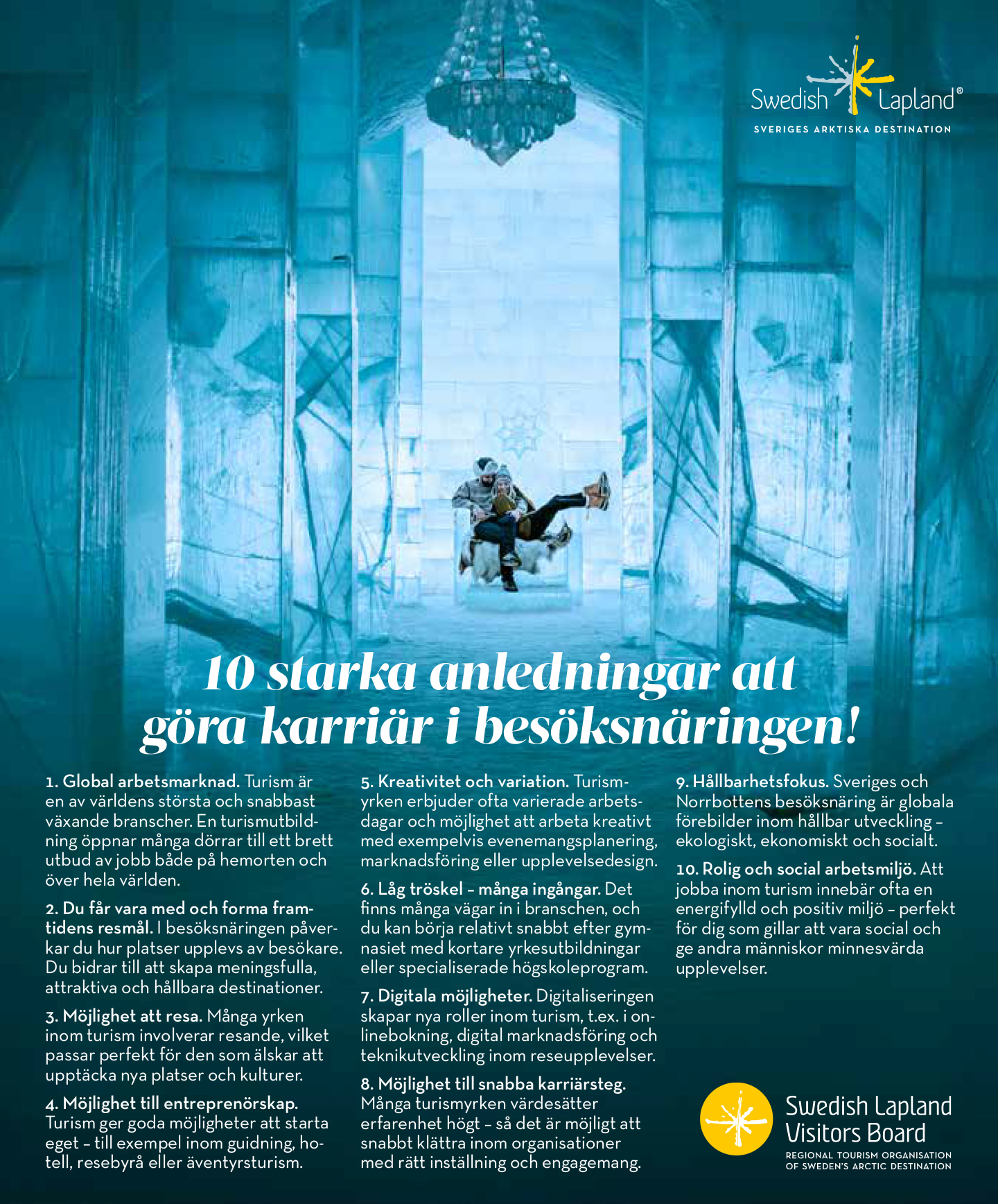Destinationsutvecklare, Turismstrateg/Turismutvecklare, Platsmarknadsförare (Place branding), Researrangör/Produktutvecklare inom turism, Turistguide/Upplevelseguide, Evenemangskoordinator/Event manager, Hotellchef/Receptionschef, Turistinformatör, Revenue manager (intäktsoptimerare), Hållbarhetssamordnare inom turism,